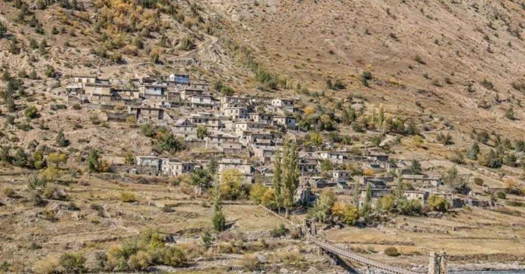 The village is located at the spot where two mountain streams—the Yotse Chu and the Zanskar Chu—meet to form the Bhaga River. This makes the landscape look like a painting, with grey mountains, a sparkling river, and a deep blue sky.