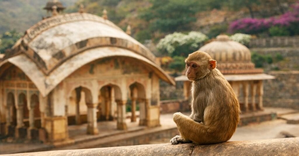If you climb the stairs behind the temple, you will reach a forest area called Mrigasthali.